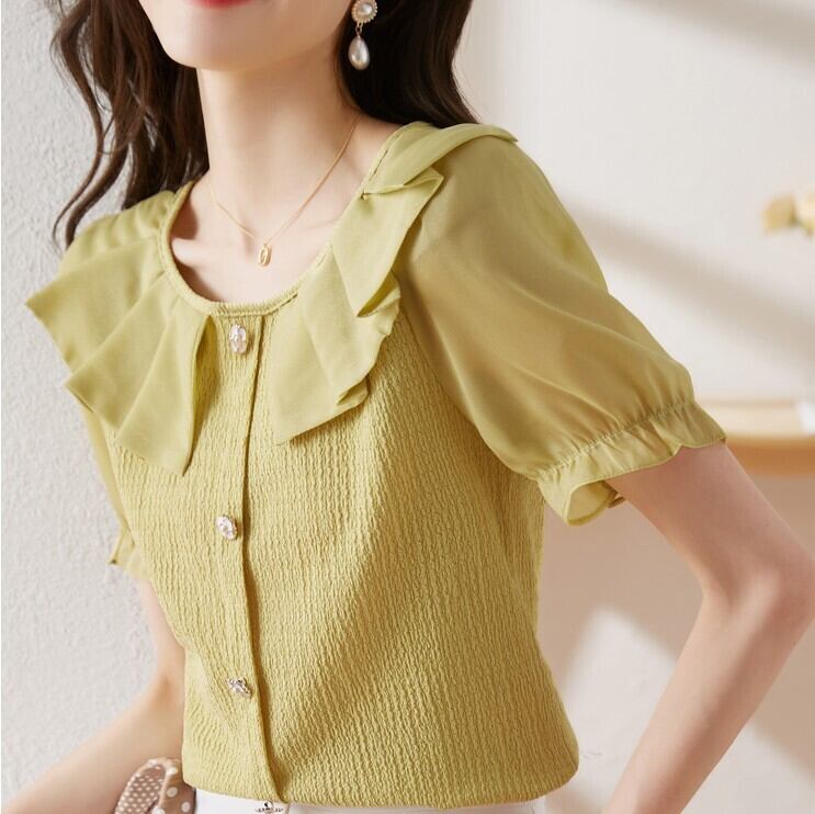 トップス レディース シャツ ブラウス 半袖 パフスリーブ 襟付き プリーツ シフォン フリル かわいい 大人可愛い きれいめ 上品 エレガント 清楚 フェミニン おしゃれ お洒落 綺麗 お嬢様 おとな ナチュラル こなれ感 ラブリー キュート ガーリー レトロ ロマンチック 抜け感 華やか 主役級 存在感 OL 通勤 学生 通学 デート お出かけ 休日 S M L XL 2XL グリーン 緑 夏 20代 30代 40代 韓国 韓国系 着回し 普段使い ファッション コーデ 送料無料