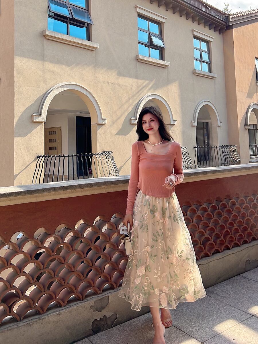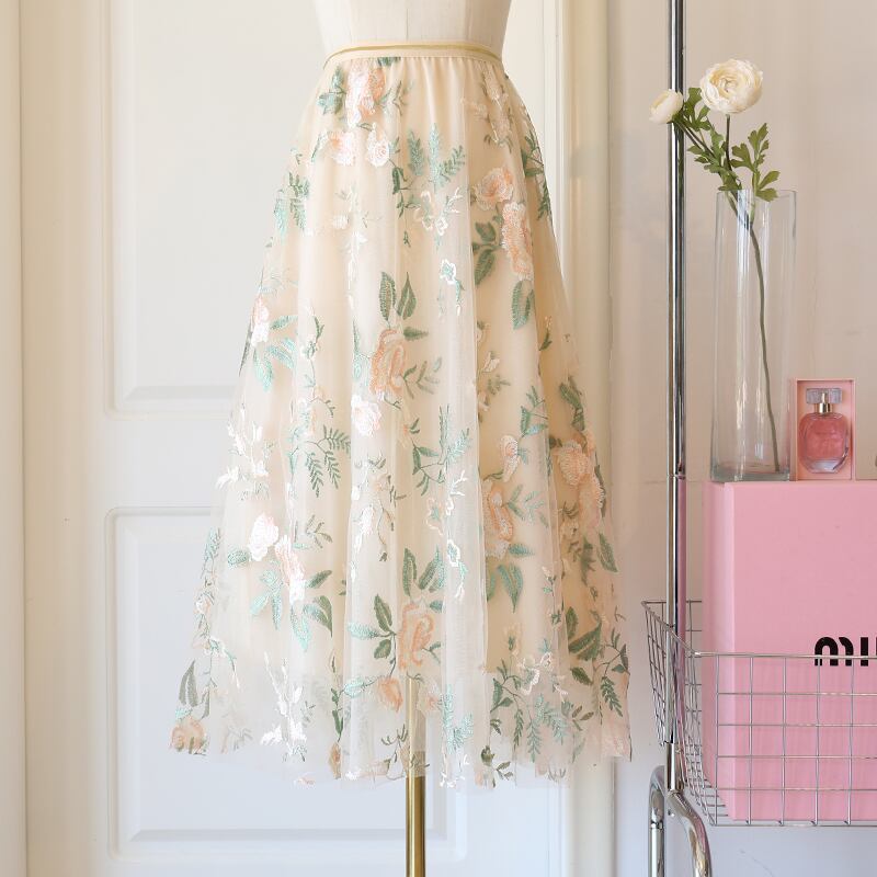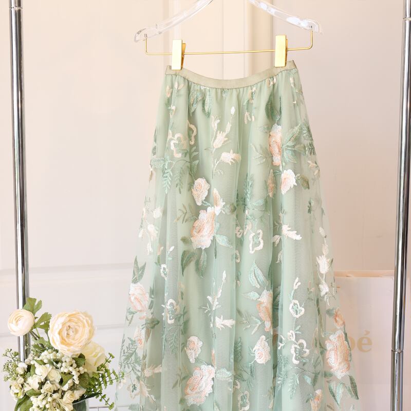 スカート レディース チュールスカート フレアスカート 花柄スカート ロングスカート 2色 ミモレ丈 レース チュール 刺繍 花柄 透け感 切り替え Aライン ウエストゴム かわいい 大人可愛い きれいめ フェミニン おしゃれ お洒落 おとな ナチュラル キュート ガーリー 通勤 OL 学生 通学 デート お出かけ 女子会 旅行 アプリコット グリーン 春 夏 秋 冬 10代 20代 30代 韓国 韓国系 着回し 普段使い 重ね着 体型カバー 韓国ファッション フレンチファッション キュート 送料無料