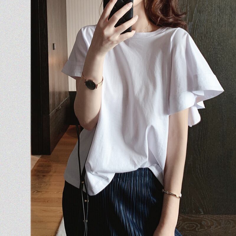 トップス レディース 2色 Tシャツ カットソー シャツ 半袖 フレアスリーブ ラウンドネック かわいい 大人可愛い きれいめ シンプル カジュアル エレガント 清楚 フェミニン おしゃれ お洒落 おとな ナチュラル こなれ感 ラブリー キュート ガーリー 抜け感 爽やか 主役級 存在感 無地 OL 通勤 学生 通学 デート お出かけ 休日 S M L XL ホワイト 白 ブラック 黒 夏 20代 30代 40代 韓国 韓国系 着回し 普段使い 体型カバー コーデ インスタ 送料無料