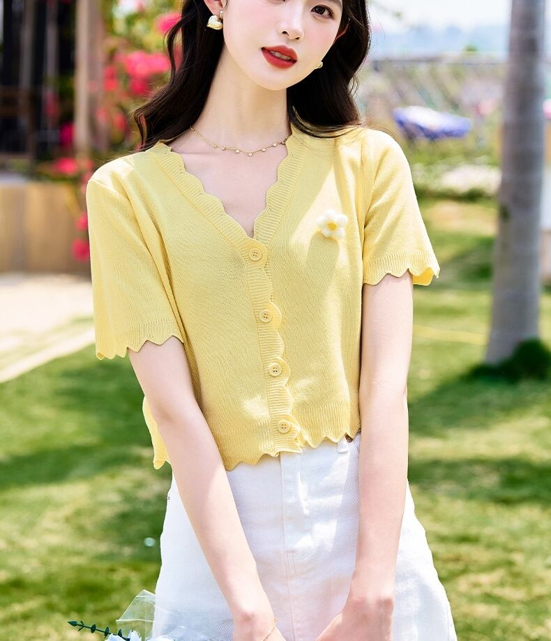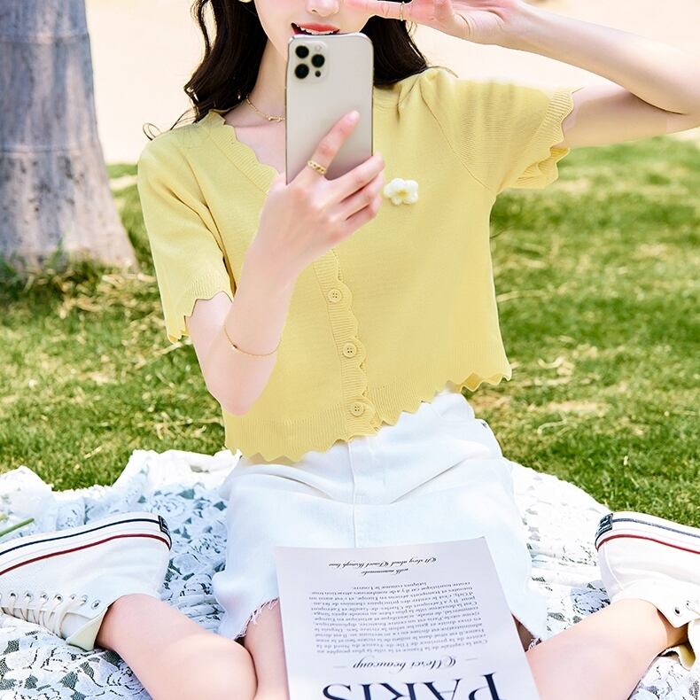 トップス レディース カーディガン ニット ニットソー 半袖カーディガン カットソー 前開き 花柄 モチーフ付き 襟なし 半袖 スカラップ バイカラー レトロ きれいめ かわいい 大人可愛いVネック カジュアル クロップ丈 フェミニン 清楚 ラフ ガーリー キュート オフィス OL 通勤 通学 学生 お呼ばれ きちんと感 クール 休日 普段使い 着回し ファッション コーデ 10代 20代 30代 春 夏 秋 学校 プチプラ 海外 楽ちん ワンサイズ パープル イエロー ブラック ホワイト 送料無料