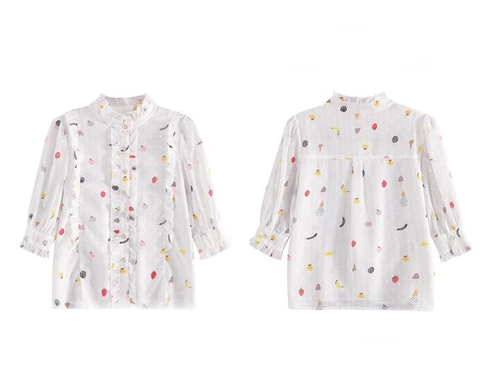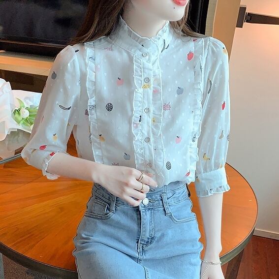 トップス レディース シャツ ブラウス ショート丈 五分袖 パフスリーブ フルーツ 果物 ドット 水玉 シアー スタンドカラー かわいい 大人可愛い きれいめ カジュアル 上品 エレガント 清楚 フェミニン シック おしゃれ 綺麗 ナチュラル こなれ感 ラフ ラブリー キュート ガーリー 抜け感 華やか 存在感 花柄 小花柄 フラワー OL 通勤 学生 通学 デート お出かけ 女子会 休日 春 夏 10代 20代 30代 韓国 着回し 普段使い 体型カバー S M L XL 2XL 送料無料