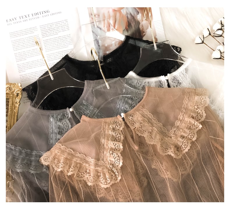 トップス レディース 4色 カットソー シャツ ブラウス 長袖 襟付き ビッグカラー レース 透け感 シースルー かわいい 大人可愛い きれいめ 上品 エレガント 清楚 フェミニン おしゃれ お洒落 ナチュラル こなれ感 ラブリー キュート ガーリー ロマンチック 抜け感 華やか 存在感 OL 通勤 学生 通学 デート お出かけ 女子会 フリーサイズ ホワイト 白 ブラック 黒 ブラウン 茶色 グレー 灰色 春 夏 10代 20代 30代 韓国 韓国系 着回し 普段使い インスタ 送料無料