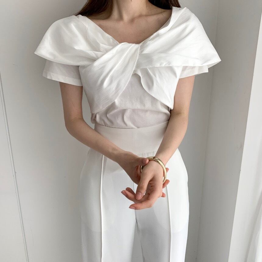 鎖骨が見えるネックラインが、女性らしい華奢な印象を与えてくれます。
