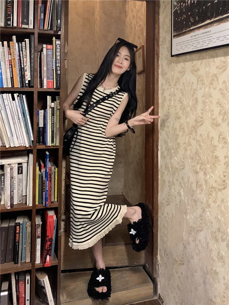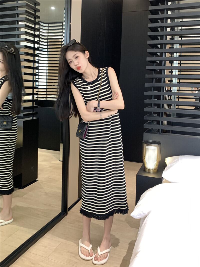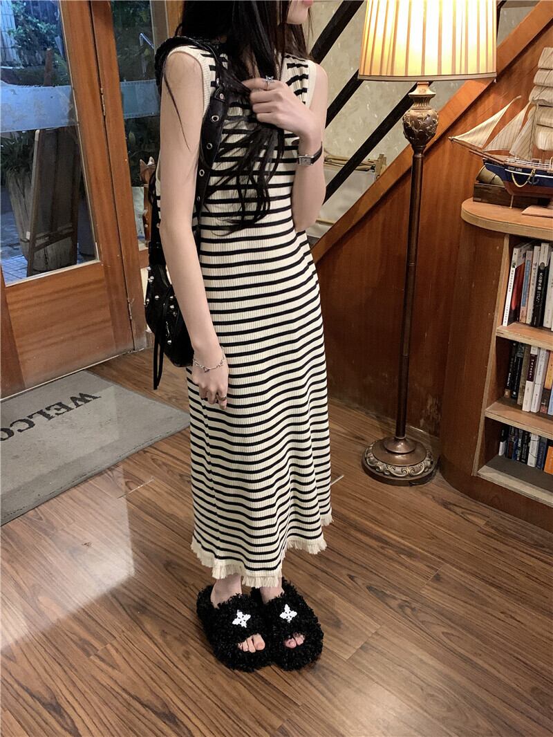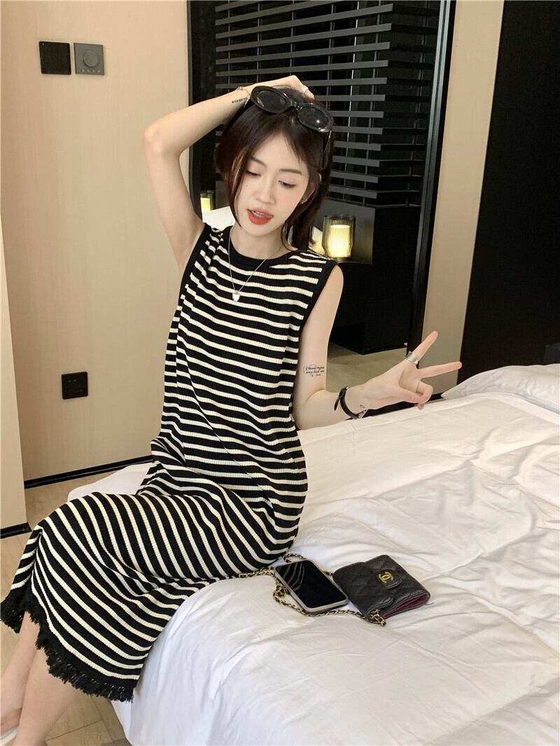ワンピース レディース 2色 ニット セーター ロングワンピース サマードレス ラウンドネック ロング丈 ノースリーブ ボーダー ストライプ バイカラー フリンジ 裾コンシャス カジュアル かわいい 大人可愛い フェミニン ガーリー キュート オフィス OL 通勤 通学 学生 休日 普段使い デート 旅行 着回し ファッション コーデ モテ 10代 20代 30代 40代 春 夏 サマーニット 学校 プチプラ 海外 旅行 楽ちん ワンサイズ ブラック ホワイト カラバリ 送料無料