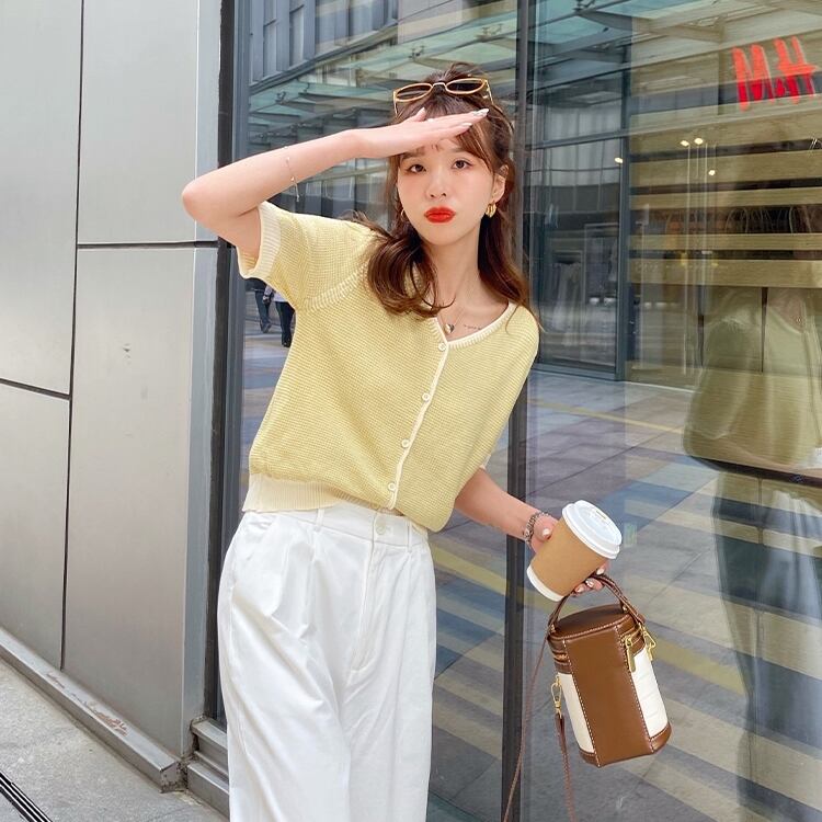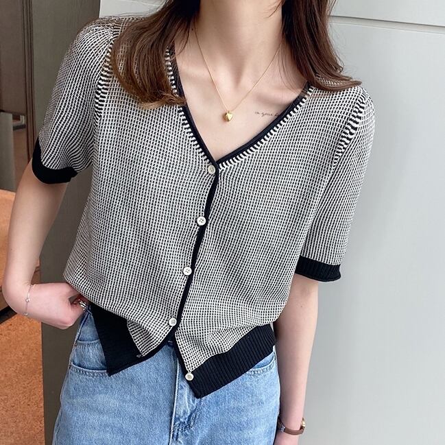 トップス レディース カーディガン ニット ニットソー 半袖 カットソー 前開き バイカラー モチーフ付き 襟なし 半袖 スカラップ バイカラー レトロ きれいめ かわいい 大人可愛い Vネック カジュアル クロップ丈 フェミニン 清楚 ラフ ガーリー キュート オフィス OL 通勤 通学 学生 お呼ばれ きちんと感 クール 休日 普段使い 着回し ファッション コーデ 10代 20代 30代 春 夏 秋 学校 プチプラ 海外 楽ちん ワンサイズ ピンク イエロー ブラック ブルー グリーン送料無料