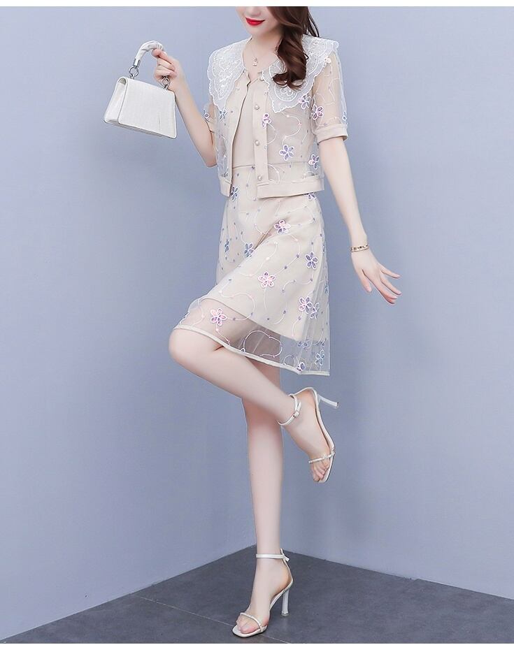セットアップ レディース トップス 大きいサイズ M L XL 2XL 3XL 4XL 5XL ワンピース 2カラー アプリコット ブラック カラバリ 2点セット ツーピース セット きれいめ 上品 華やか 半袖 レース 刺繍 花柄 スパンコール シアー 透け感 ビッグカラー 襟 ハイウエスト スタイルアップ 脚長効果 プラスサイズ お出かけ お呼ばれ 通勤 オフィス ママ 韓国 送料無料 コーデ 10代 20代 30代 40代 大人可愛い おしゃれ 存在感 パーティー セレモニー ガーリー フェミニン