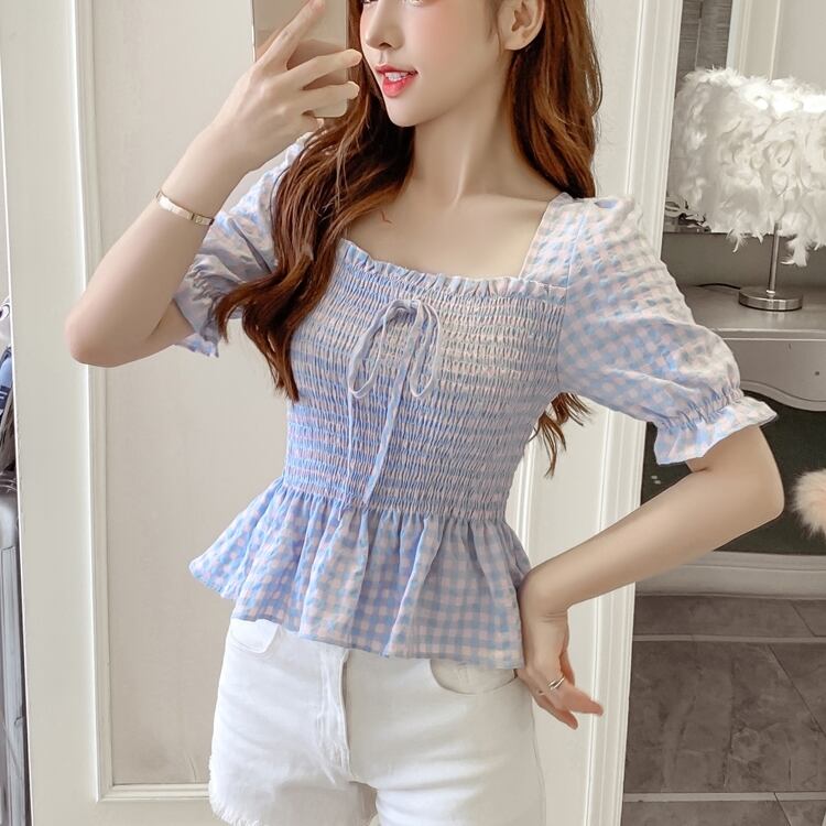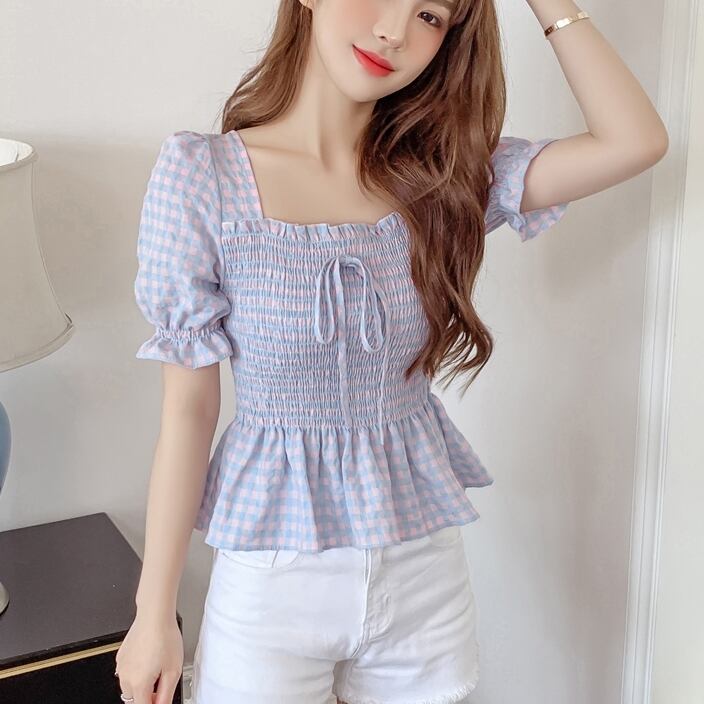 トップス レディース ブラウス シャツ 3色 レース S M L XL 2XL 大きいサイズ バックコンシャス グリーン ブルー イエローシアー ギンガムチェック ペンタゴンネック ペプラム半袖 五分袖 無地 パフスリーブ リボン フリル 華奢見え シンプル ガーリー きれいめ カジュアル フェミニン エレガント 上品 大人可愛い おしゃれ 普段使い デート お出かけ 女子会 休日 旅行 お呼ばれ 通勤 通学 着まわし 韓国系 ファッション コーデ スタイル モテ サイズ展開豊富 春 夏 秋 送料無料