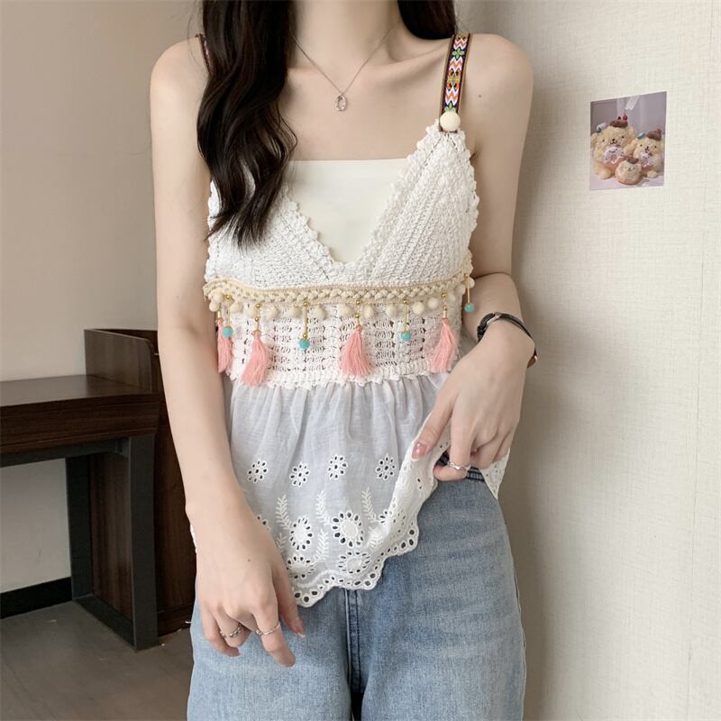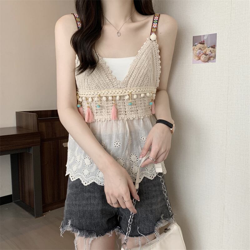 トップス レディース キャミソール 2カラー フリーサイズ ホワイト ベージュ カラバリ ニットキャミソール 異素材 ドッキング エスニック風 タッセル パンチングレース ノースリーブ 透け感 Vネック スカラップ レイヤードスタイル 重ね着コーデ ガーリー カジュアル フェミニン キュート 大人可愛い おしゃれ 普段使い デート お出かけ 女子会 休日 旅行 通学 着まわし ファッション コーデ スタイル モテ ユニーク 個性的 存在感 こなれ感 涼しげ 10代 20代 30代 春 夏 送料無料