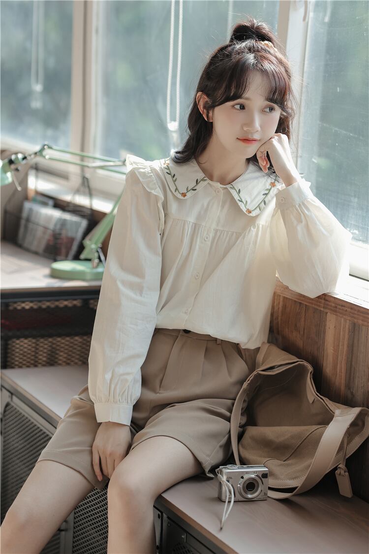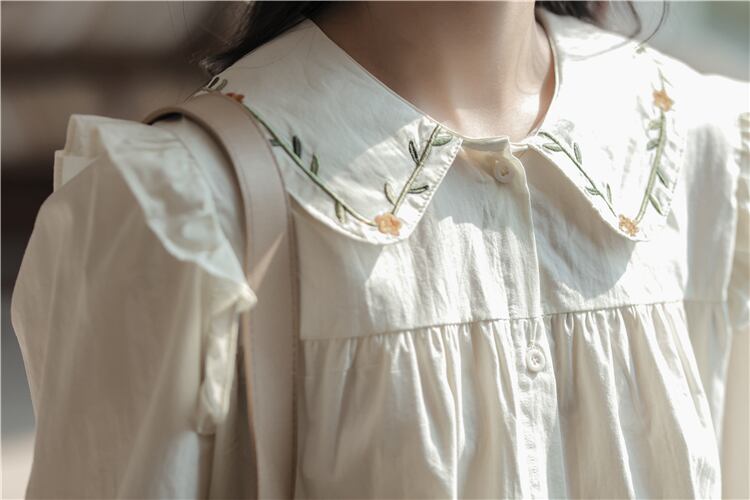 愛らしい大きめの刺繍入りの襟がキュートなブラウスです^^
