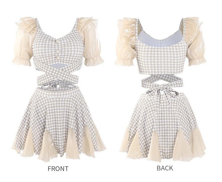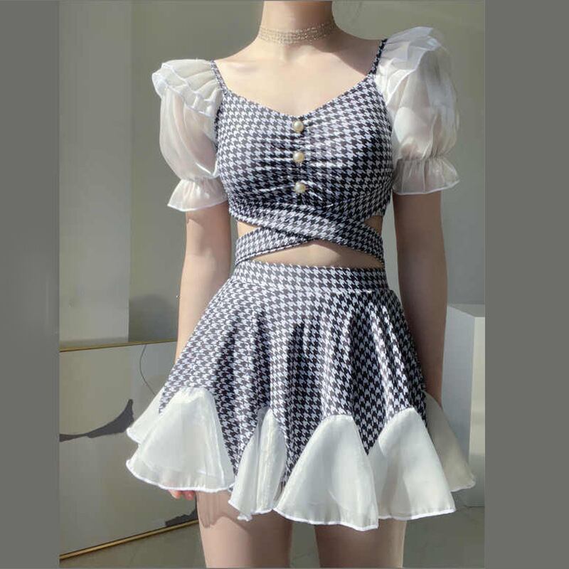 水着 レディース スイムウェア 上下セット 2カラー S M L XL アプリコット ブラック カラバリ 2点セット セパレート水着 ワンピース風 半袖 千鳥格子柄 パフスリーブ バックリボン パール フリル ミニスカート フレア 華やか ハイウエスト スタイルアップ 脚長効果 体型カバー ママ 韓国 送料無料 モテ 10代 20代 30代 大人可愛い おしゃれ ガーリー フェミニン ラブリー キュート 海 プール ビーチ リゾート 旅行 デート 休日 夏休み サマー 夏 安心感 存在感 主役級