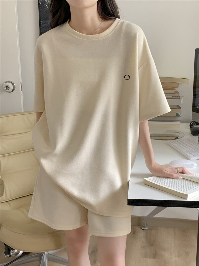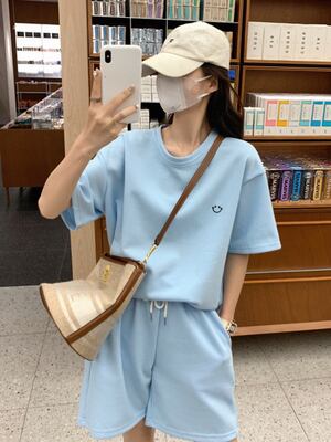 セットアップ レディース 4色 ルームウェア S M L XL ショートパンツ スウェット ジャージ ショート ショート丈 半袖 5分袖 五分袖 ラウンドネック かわいい 大人可愛い カジュアル おしゃれ お洒落 ナチュラル ルーズ リラックス レトロ 抜け感 爽やか 主役級 存在感 無地 学生 お泊まり 休日 運動 ジム ヨガ アプリコット ピンク ブルーグリーン 春 夏 上下セット 2点セット ツーピース 10代 20代 韓国 韓国系 着回し 体型カバー 楽ちん モテ インスタ 送料無料