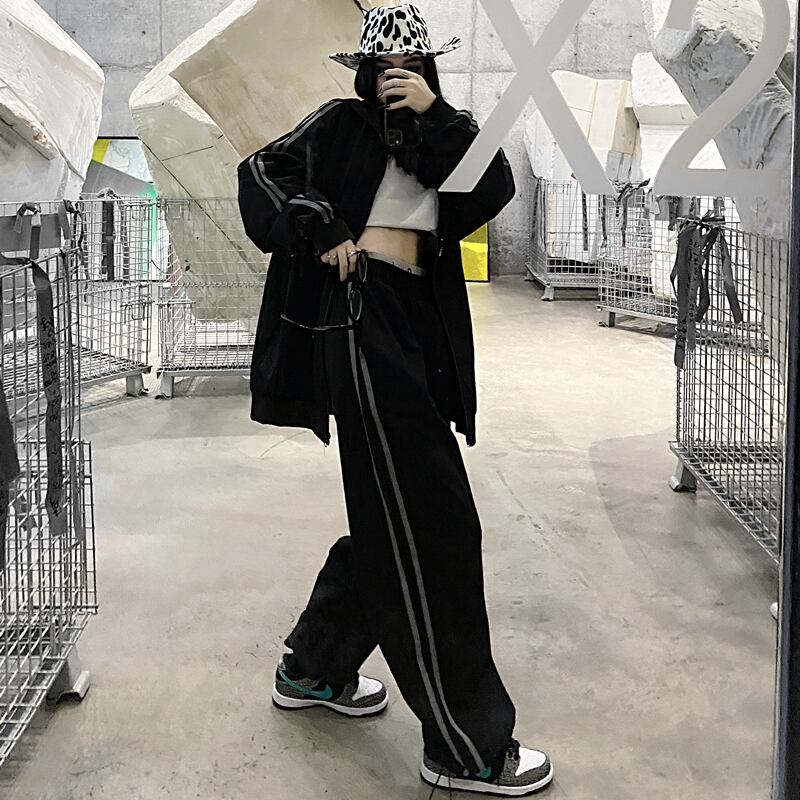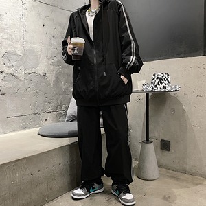 リラックス感とおしゃれを両立したラインスウェットトップスとパンツのセット。