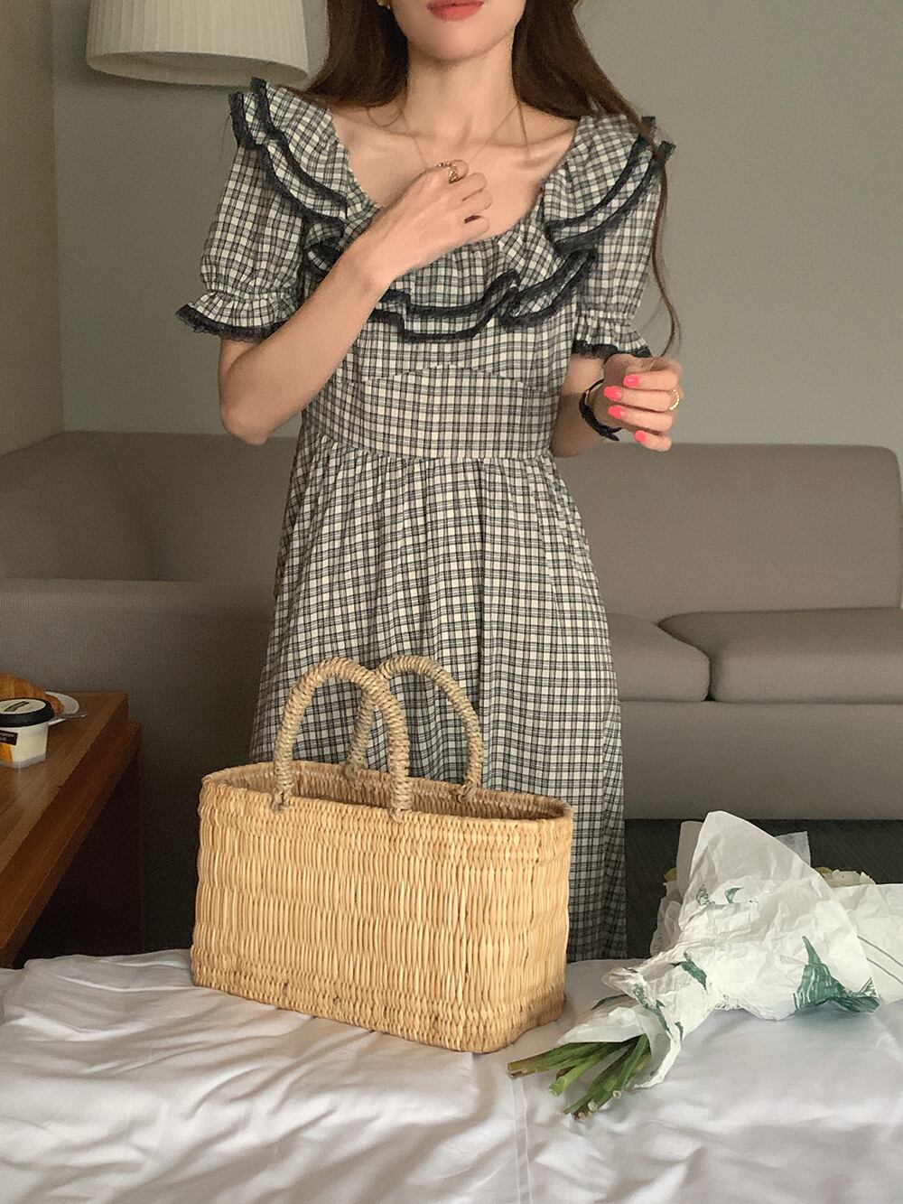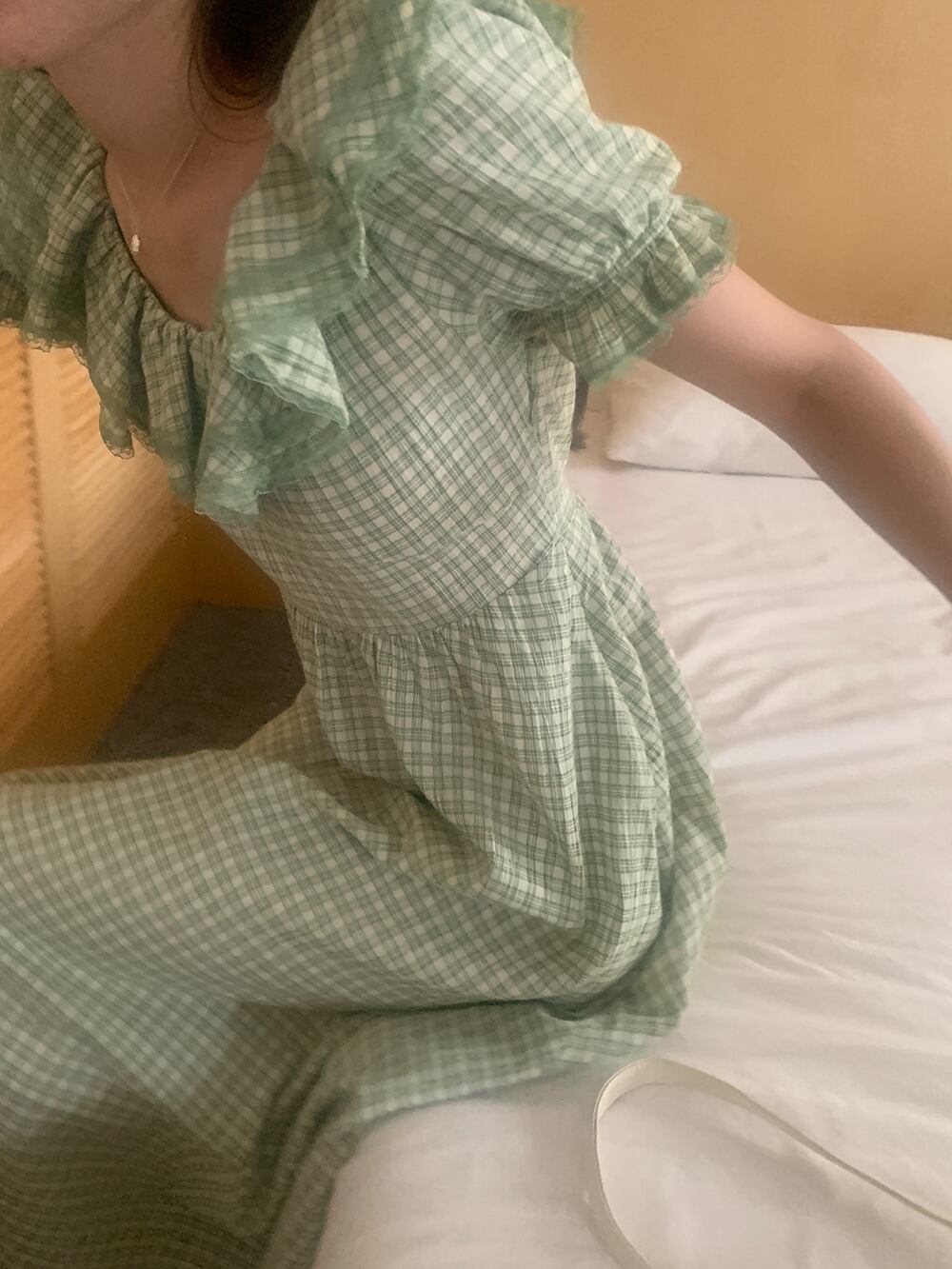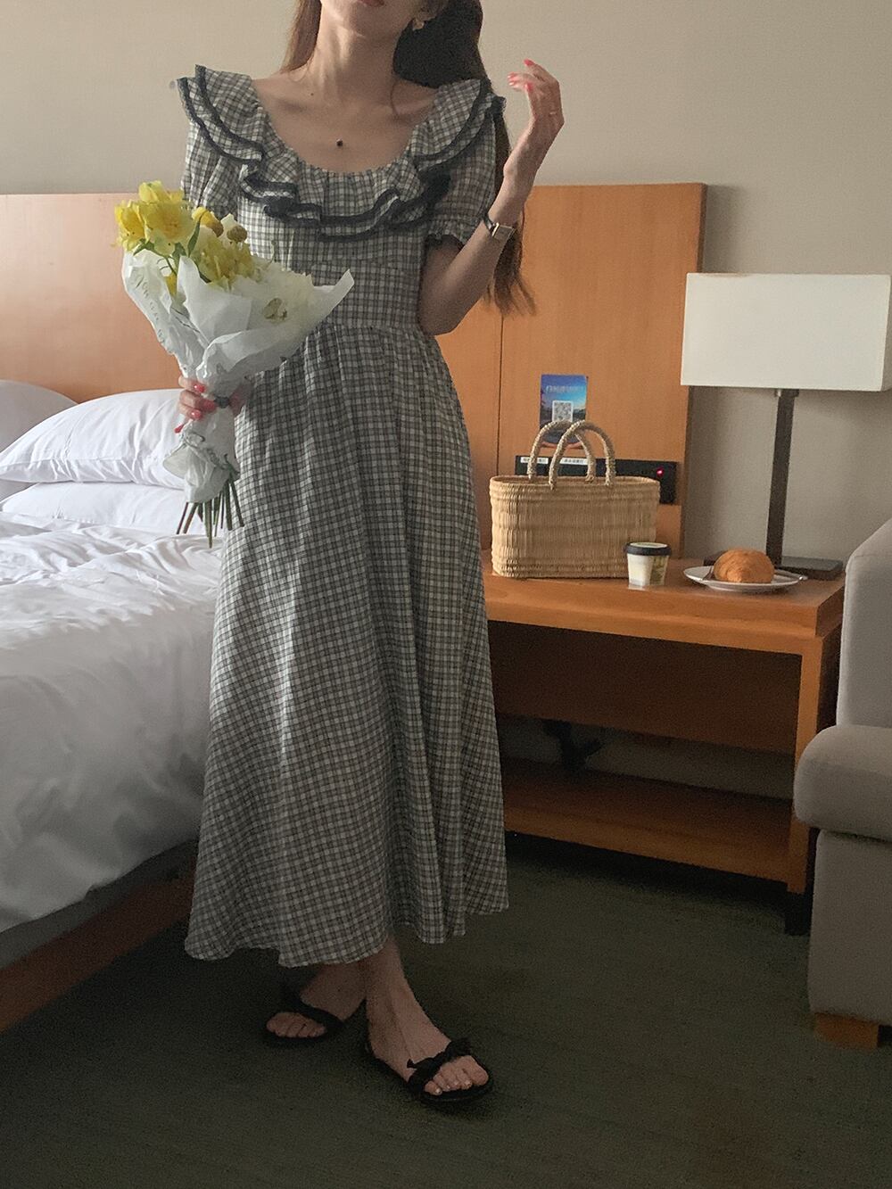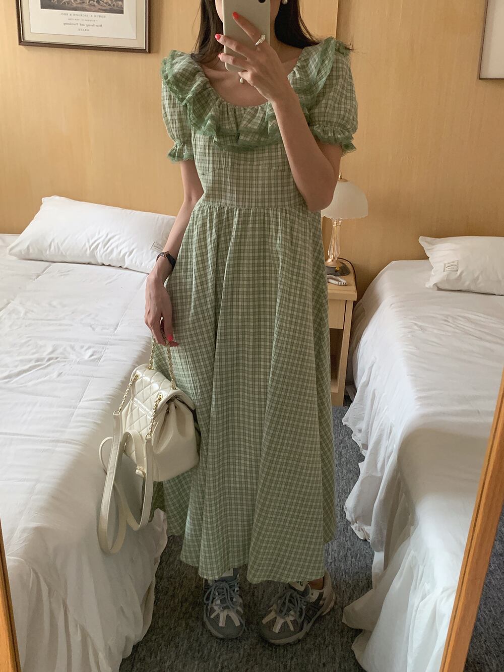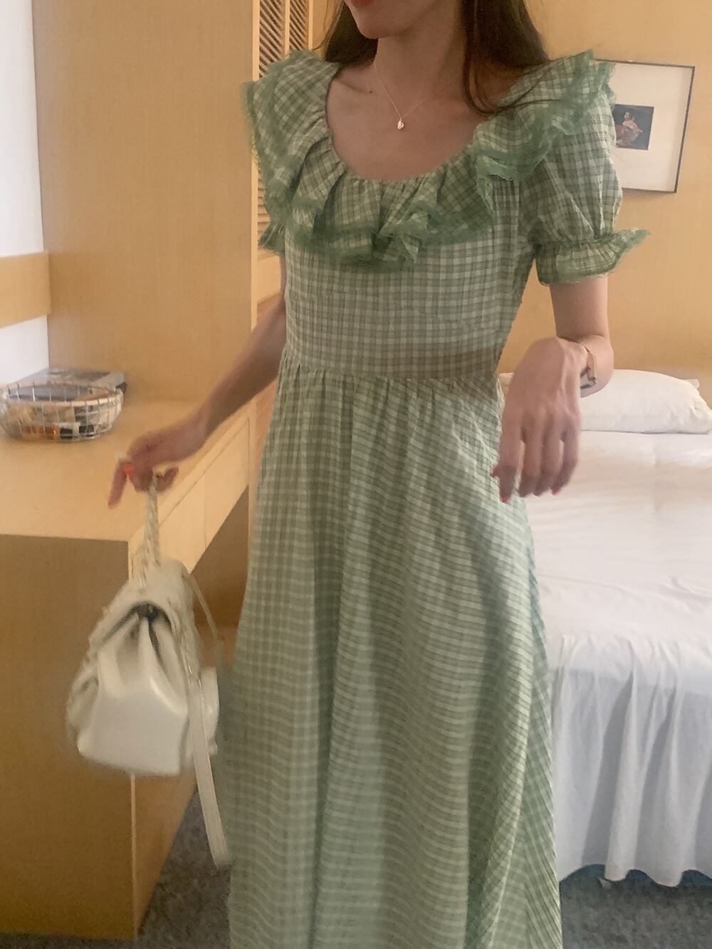 ワンピース レディース ロングワンピース フリル ロングワンピ ワンピドレス ミモレ丈 ロング丈 ビックカラー フリルカラー 半袖 五分袖 Aライン フリル 切り替えデザイン 薄手 かわいい 大人可愛い カジュアル 大人 おしゃれ レトロ 大人女子 こなれ感 ラフ ラブリー キュート ガーリー 個性的 抜け感 チェック柄 夏 10代 20代 30代 OL 学生 デート お出かけ 女子会 休日 街歩き 散歩 着回し 普段使い 韓国系 ファッション モテ 体型カバー ブラック 黒 グリーン 緑 送料無料