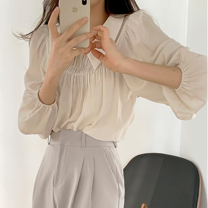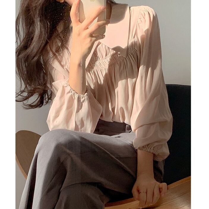 トップス レディース ブラウス シャツ S M L XL ロング丈 長袖 タック ドールカラー ボリューム袖 ふんわり袖 襟付き プルオーバー ギャザー フリル カジュアル かわいい 大人可愛い きれいめ シンプル 上品 おしゃれ お洒落 綺麗 セクシー こなれ感 ガーリー 抜け感 とろみ感 ピンベージュク ホワイト 白 通勤 学生 デート お出かけ 女子会 休日 公園 春 夏 秋 10代 20代 30代 40代 韓国 韓国系 普段使い 定番 体型カバー ママ ファッション 送料無料