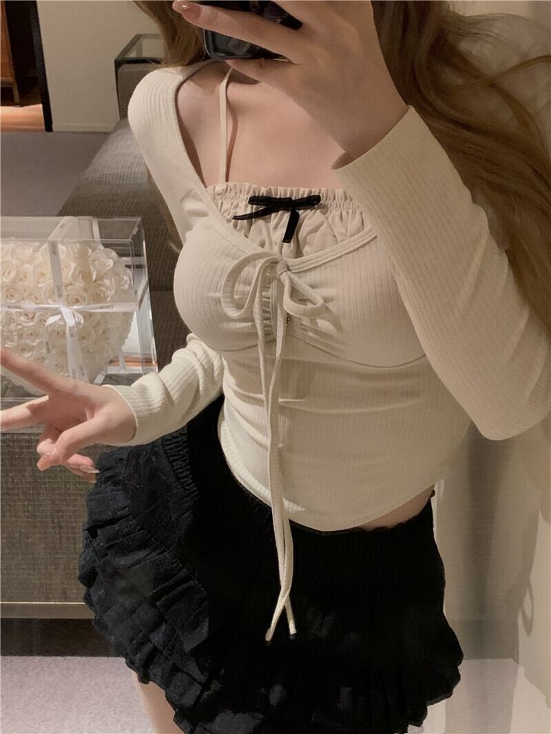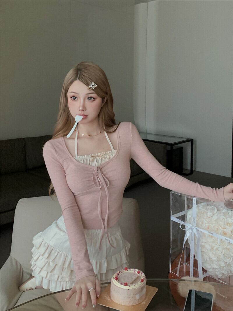 【着用レビュー】トップス レディース 重ね着風トップス 2カラー S M ピンク ホワイト Tシャツ リボン シャーリング ホルターネック リボン フェイクレイヤード ペプラム ショート丈 クルーネック 長袖 プルオーバー シンプル きれいめ カジュアル フェミニン キュート ガーリー 大人可愛い おしゃれ 普段使い イベント デート お出かけ 女子会 休日 旅行 通勤 通学 着まわし こなれ感 韓国系 ファッション コーデ スタイル モテ 春 秋 送料無料