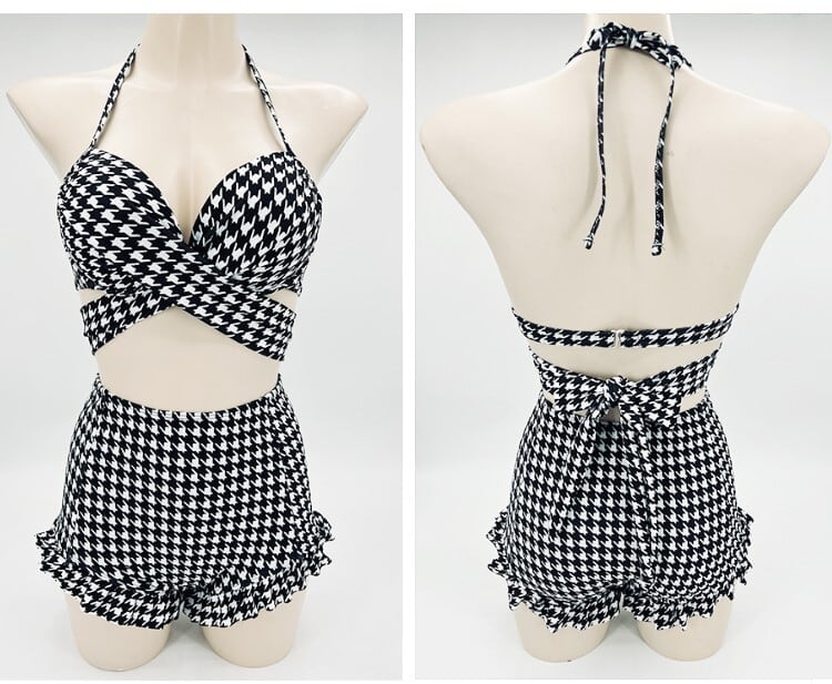水着 レディース ビキニ セパレート パッド付き ハイウエスト 千鳥格子柄 胸元 谷間 谷間魅せ フリル かわいい 大人可愛い きれいめ シンプル カジュアル 上品 エレガント おしゃれ 綺麗 お嬢様 クール モード系 セクシー 大人 おとな 存在感 こなれ感 ラブリー キュート ガーリー ルーズ レトロ シック S M L XL ブラック 黒 千鳥柄 夏 学生 リゾート 旅行 海 プール 10代 20代 30代 40代 ママ 韓国系 定番 ファッション 体型カバー コーデ モテ トレンド 流行 送料無料