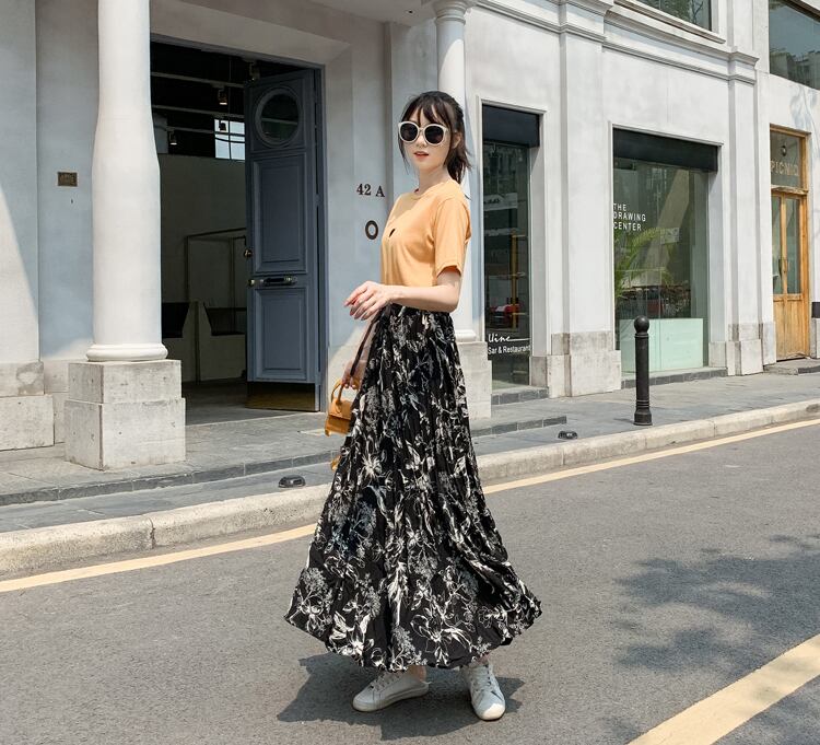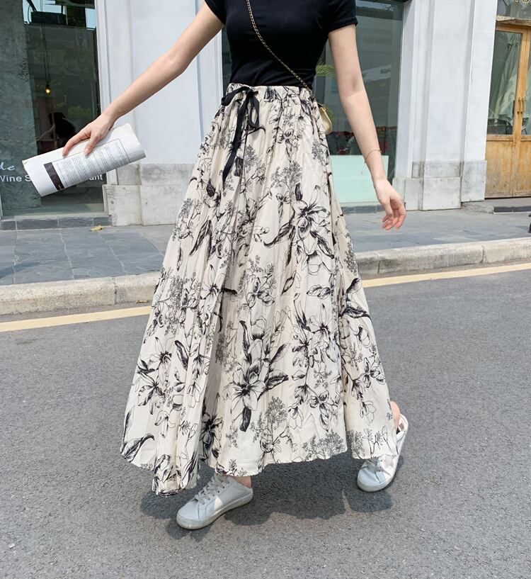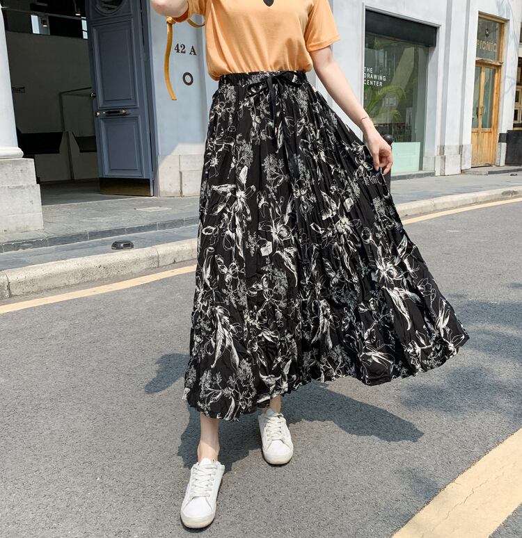 スカート レディース 2色 ロングスカート プリーツスカート シフォン ハイウエスト ウエストゴム かわいい 大人可愛い きれいめ 上品 エレガント 清楚 フェミニン おしゃれ お洒落 綺麗 おとな ナチュラル こなれ感 レトロ アンティーク ロマンチック 抜け感 華やか 主役級 存在感 花柄 フラワー OL 通勤 学生 通学 デート お出かけ 女子会 カフェ巡り お買い物 フリーサイズ ゆったり ゆる ホワイト 白 ブラック 黒 春 夏 20代 30代 40代 韓国 韓国系 着回し 普段使い 送料無料