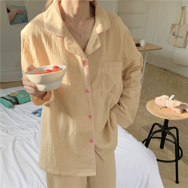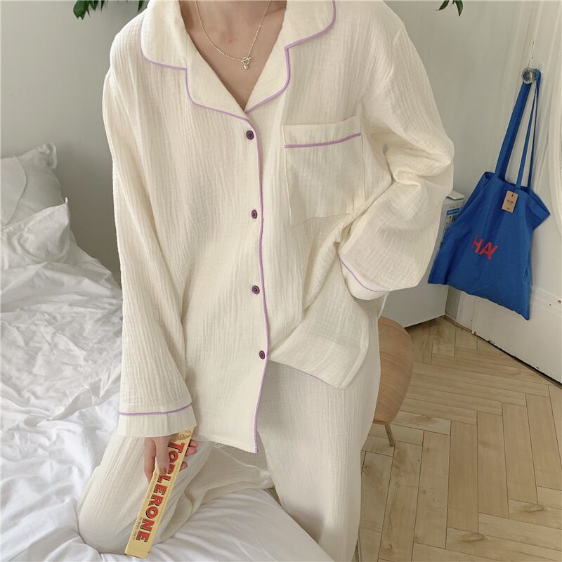 パイピングが可愛い開襟シャツと質感がこなれたガーゼ風生地でガーリーな雰囲気に。